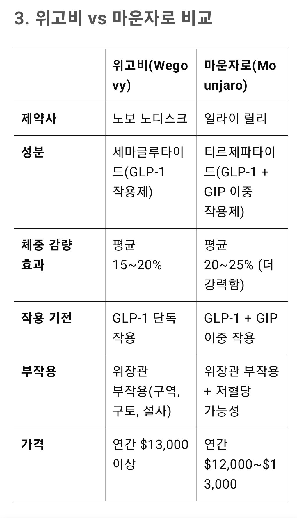 부작용: 둘 다 위장관 부작용이 흔하지만, 마운자로는 GIP 작용으로 인해 저혈당 위험이 더 클 수 있음.