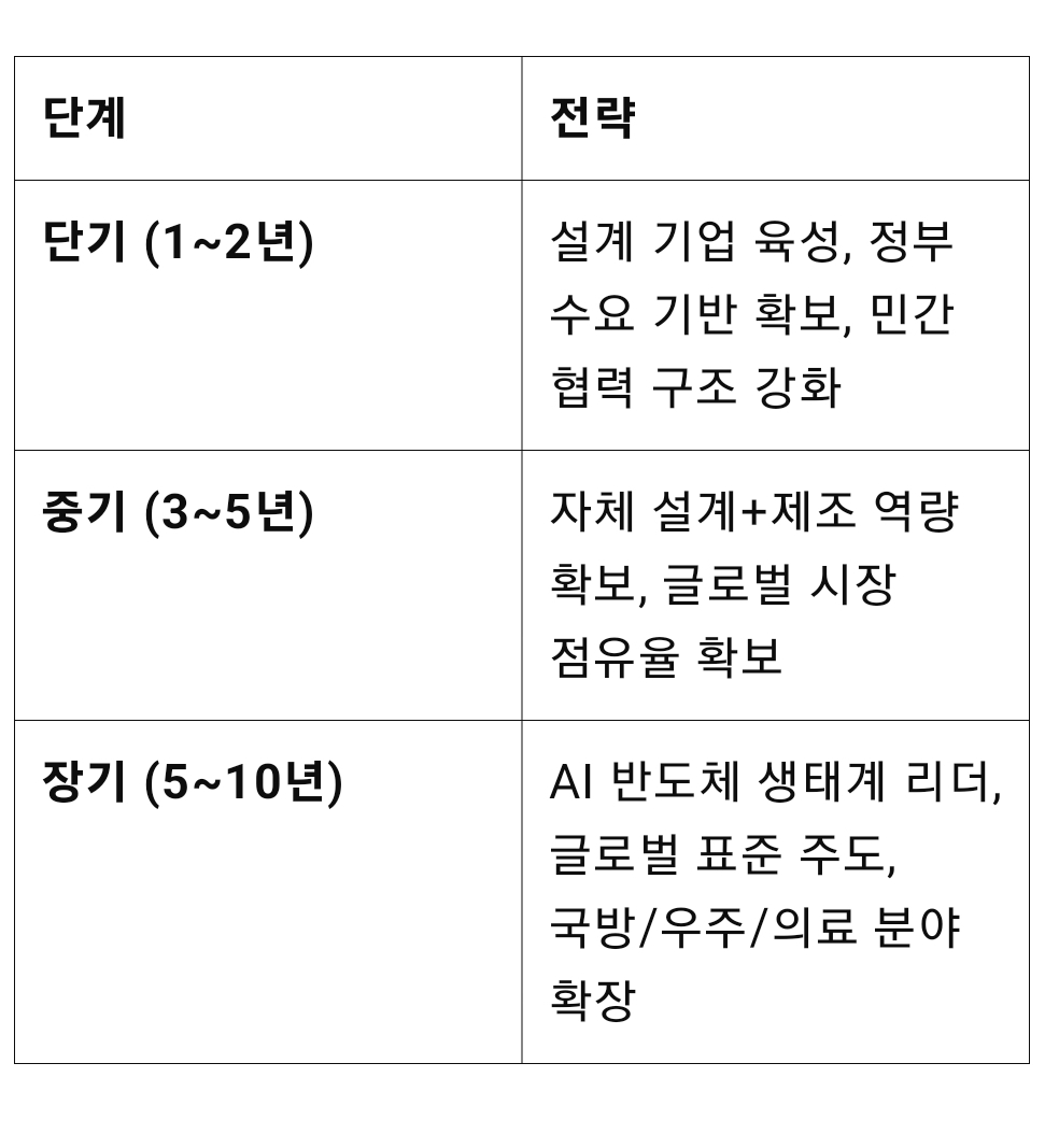 정부는 AI 반도체를 차세대 국가 전략산업으로 지정해 설계 기업 육성, 세제 지원, 공공시장 창출에 주력해야 함.