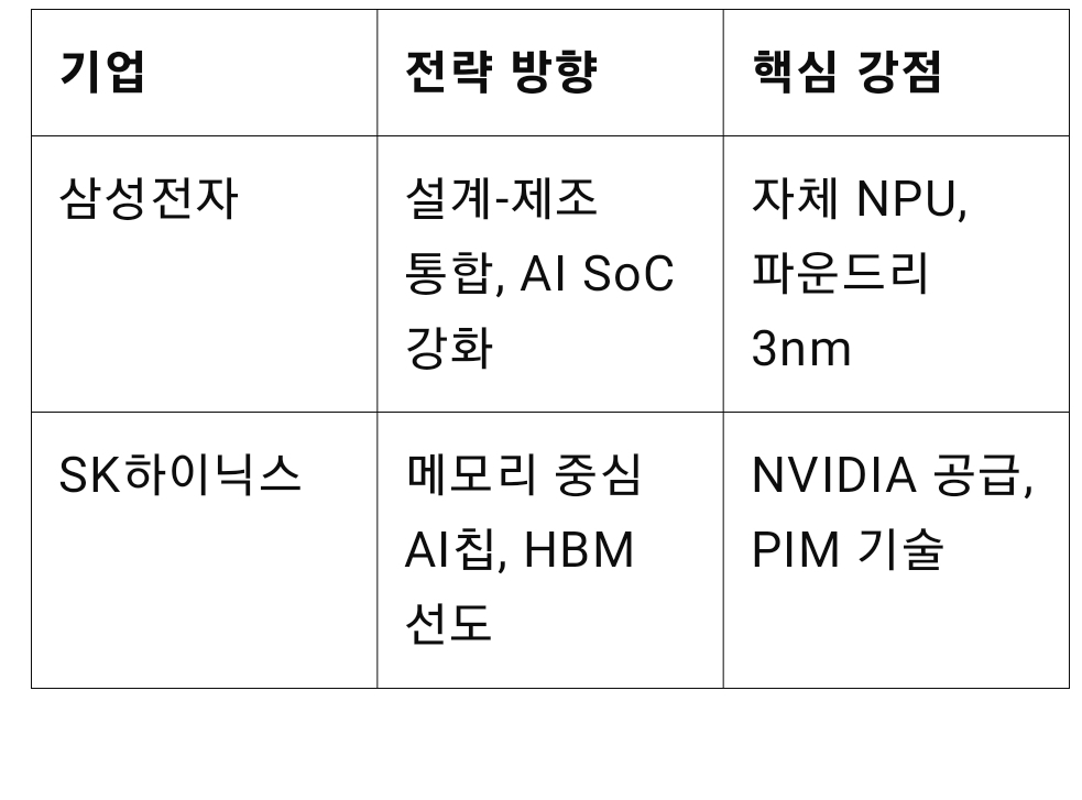 삼성·SK하이닉스는 각각 설계 통합형 AI SoC, 고대역 메모리 중심 AI 칩으로 글로벌 기술 헤게모니 확보가 핵심.