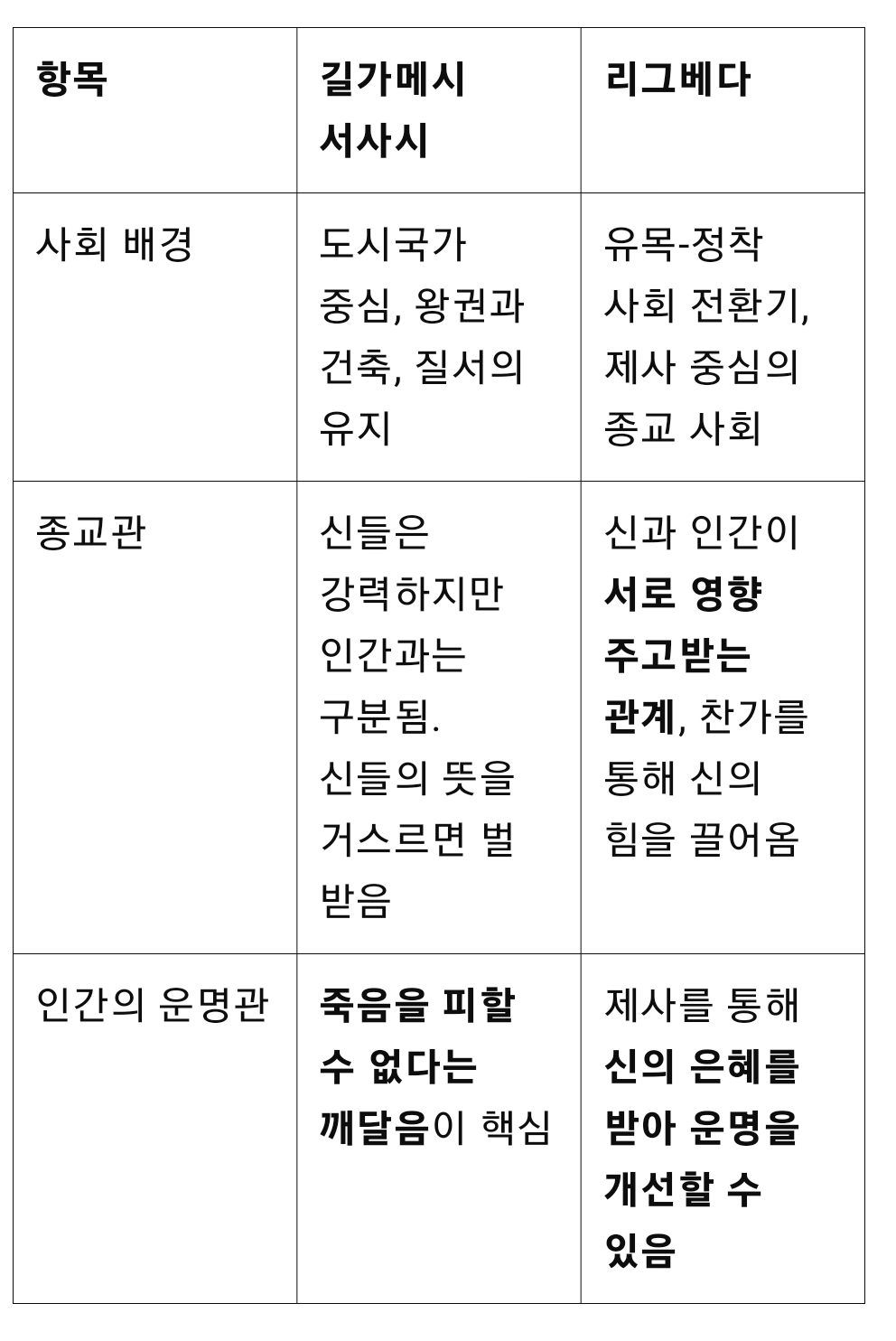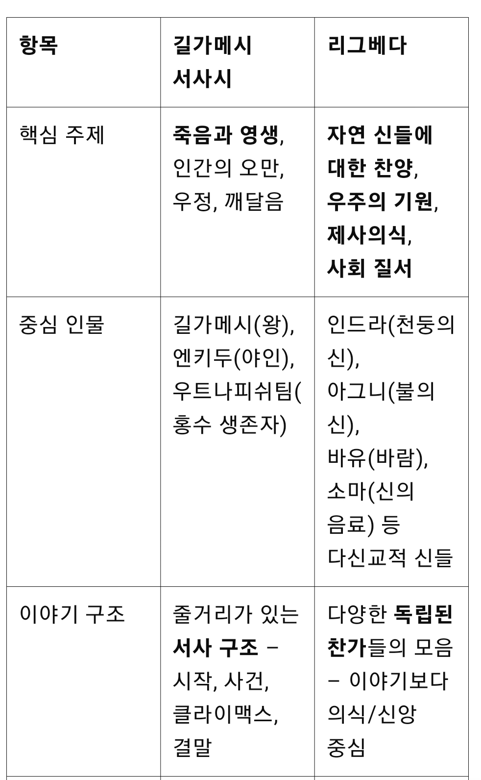 《길가메시 서사시》(메소포타미아)와 《리그베다》(고대 인도)는 둘 다 세계에서 가장 오래된 문학 작품이지만, 작성 목적, 형식, 주제, 문화적 배경이 매우 다릅니다. 아래에 비교해서 정리해 볼게요.