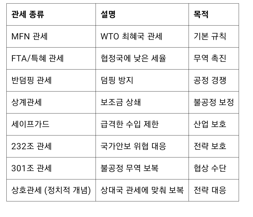미국의 관세 체계에는 기본관세(MFN)와 상호관세 외에도 다양한 종류의 관세가 있습니다.