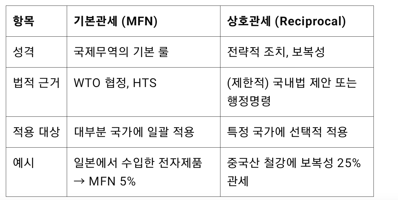 **기본관세(Most-Favored-Nation Tariff, MFN Tariff)**와 **상호관세(Reciprocal Tariff)**